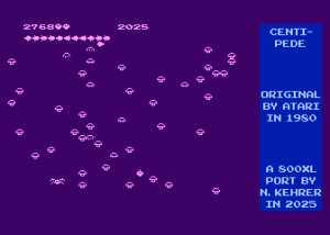 Kolejny emulator gry arcade napisany przez Norberta Kehrera. Przypuszczalnie korzysta z oryginalnych ROMów z MAME, jak poprzednie jego emulatory. Samej gry nie ma co przedstawiać, gdyż jest ona raczej znana wszystkim fanom gier – trzeba rozwalać robactwo spadające z góry, które po strzale zamienia się w grzybki (ciekawe swoją drogą, co autor oryginału brał, skoro wpadł na taki pomysł). Rozgrywka toczy się w hiresie i jest niestety nieco wolniejsza niż na automacie, ale i tak brawa dla autora za przeniesienie wersji arcade (kolejnej już) na nasze Atari.