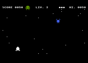 Już po uruchomieniu wiadomo, kto grę napisał i wypuścił na tysiące komputerów na raz… Pionowy shooter w trybie znakowym, niestety jego grywalność zabija brak płynnego scrolla, przez co traci się w dużej mierze przyjemność z gry. Przypomina nieco wcześniej opisanego AI SHOOTERA, ale wydaje mi się, że jest mniej grywalny, jak dla mnie…
