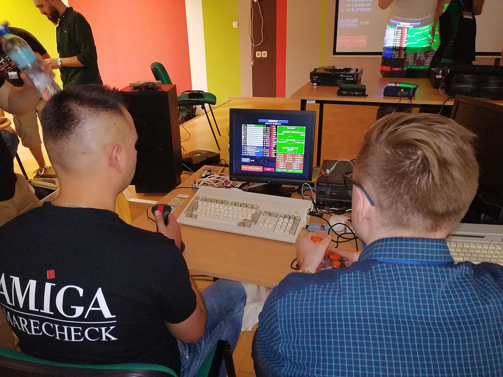 Najbardziej dumny jestem jednak z pewnego brązowego medalu, trzeciego miejsca podium, które osiągnąłem w Sensible World of Soccer na Amigę. Ogromne zmagania podzielone na kilka grup po bodajże sześciu zawodników, cztery Amigi i wielki projektor zajęte non stop! Trzeszczące dżojstiki kontra dziwne klawiaturowe kontrolery profesjonalnych graczy. Turniej mocno obsadzony, gdyż pojawiła się tutaj trójka wyjadaczy z Ekstraklasy Sensible Soccera, grających setki, jeśli nie tysiące meczyków online każdego roku. Na każdej Retronizacji dziurawili nam dupska niczym durszlaki i zajmowali całe podium dla siebie… Tym razem było jednak inaczej. Pojawił się ktoś, kto podniósł rękawicę (a raczej korki) i przeciwstawił się hegemonii profesjonalistów! Ostatnia nadzieja białych (czytaj amatorów sensibla), człowiek grający na starość tylko na zlotach (chociaż w przeszłości uczestnik wielu turniejów) – RetroBorsuk! Czyli, że kto? Niby ja? Normalnie jaja! Panowie nie będę wam pisał o rozgrywkach w grupie, gdzie moją Serbią zająłem drugie miejsce, za X-Fleą – kozakiem pro, który wygrał ze mną 2:0. Poziom zmagań grupowych był wysoki, ale jakimś fartem udało mi się awansować… Po wyjściu z grupy spotkałem się w ćwierćfinale z moim odwiecznym rywalem i przyjacielem jednocześnie czyli Marechckiem, gdzie udało mi się pokonać w dwumeczu jego Brazylię. Minimalnie, ale zawsze do przodu! W półfinale trafiłem na Cinka (gracz pro), który w Sensibla gra jak maszynka. W pierwszym spotkaniu półfinałowym zgolił mnie 3:0 niczym frajera. W rewanżu cisnąłem go troszkę, nie powiem, ale wygrałem tylko 1:0, co oznaczało dla mnie brak dalszego progresu. Ale i tak uznałem ten wynik za sukces!