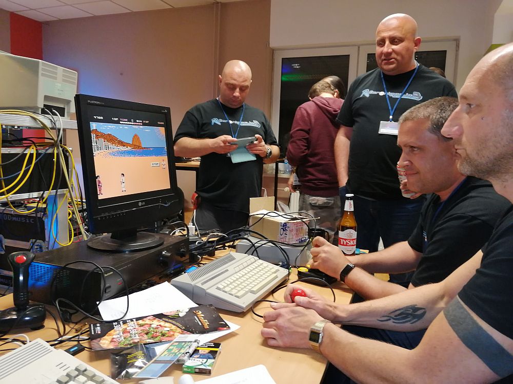 Podziękowałem Nekro i połaziłem jeszcze po stanowiskach innych moich ulubieńców: Marechcka – który miał fajną ściankę z Amigą 1200 i plakatami z gier, retroSZPUNTafana – który przytargał swoja cudowną błękitną komodę, popatrzyłem jak retrogulaszowe ziomki ciupią na C64 Mini. Ależ to maleństwo! Do kieszeni można schować i posiada całkiem dobry zestaw wbudowanych gier. Oczywiście można go zhackować i wgrywać własne tytuły… No tak gadały tam przekupy jakieś…